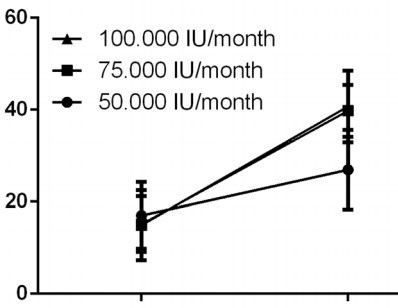 Forty-eight ALS patients, 34 with deficient (<20 ng/mL) and 14 with insufficient (20-29 ng/mL) serum levels of 25(OH)D, were randomized and treated by 3 different doses of cholecalciferol 50.000, 75.000 and 100.000 international units (IU) /month and evaluated after 6-months. Assessment of motor dysfunction at baseline and after 6 months included ALS Functional Rating Scale-Revised (ALFRS-R) and upper motor neuron (UMN) scores and blood samples for 25(OH)D levels.RESULTS: