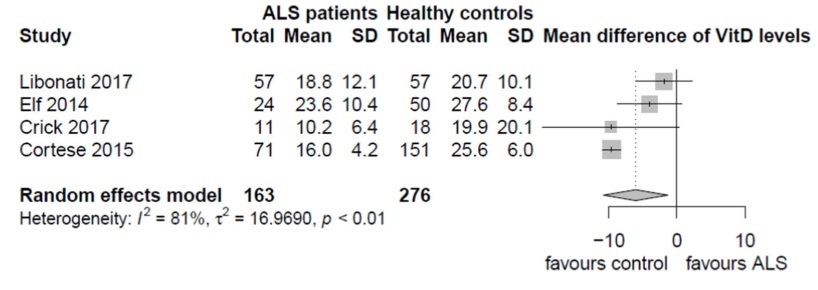 The meta-analysis did not find a correlation between ALS with Low Vitamin D - July 2020Is There a Role for Vitamin D in Amyotrophic Lateral Sclerosis? A Systematic Review and Meta-Analysis