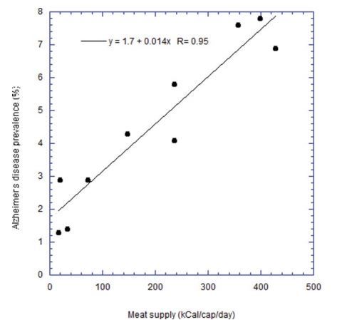 along with dietary supply data 5, 10, and 15 years before the prevalence data. Dietary supply of meat or animal products less milk 5 years before AD prevalence had the highest correlations with AD prevalence in this study. Thus, reducing meat consumption could significantly reduce the risk of AD as well as of several cancers, diabetes mellitus type 2, stroke, and, likely, chronic kidney disease.