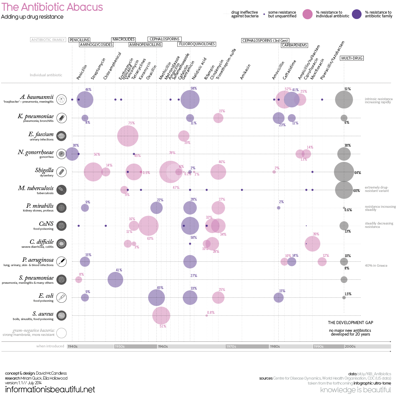 Antibiotic resistance charts by Information Is Beautiful - 2014
