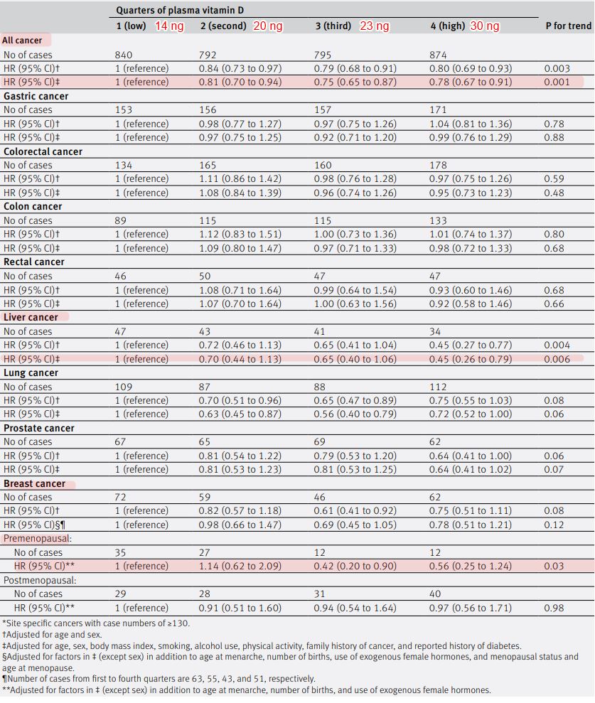 Results Plasma 25-hydroxyvitamin D concentration was inversely associated with the risk of total cancer, with multivariable adjusted hazard ratios for the second to fourth quarters compared with the lowest quarter of 0.81 (95% confidence interval 0.70 to 0.94), 0.75 (0.65 to 0.87), and 0.78 (0.67 to 0.91), respectively (P for trend=0.001). Among the findings for cancers at specific sites, an inverse association was found for liver cancer, with corresponding hazard ratios of 0.70 (0.44 to 1.13), 0.65 (0.40 to 1.06), and 0.45 (0.26 to 0.79) (P for trend=0.006). A sensitivity analysis showed that alternately removing cases of cancer at one specific site from total cancer cases did not substantially change the overall hazard ratios.