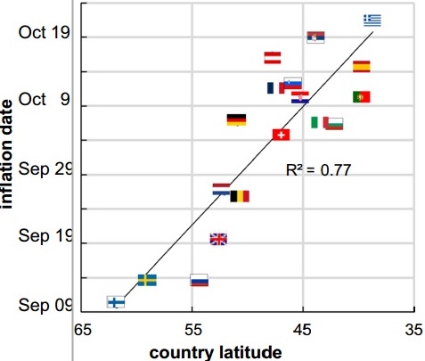 - COVID-19 onset strongly associated with latitude in Europe (Vitamin D)– Jan 21, 2021