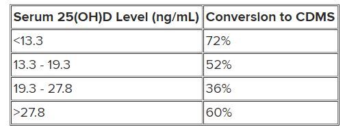 "The patients in the lowest quartile of vitamin D levels experienced the highest rate of conversion to CDMS; the rate decreased through the third quartile, but for unexplained reasons, the rate of conversion among patients with the highest vitamin D levels was not much different from that of patients with the lowest level (see table below)"