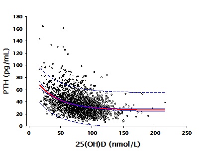 The data behind the figure come from a group of over 2,300 individuals studied in our laboratories at Creighton University in whom measurements were made of both PTH and vitamin D status [serum 25-hydroxyvitamin D – 25(OH)D]. The figure shows clearly the expected high levels of PTH at low vitamin D status values, with PTH concentration falling and becoming essentially flat as vitamin D status rises to levels in the range of 125 nmol/L (50 ng/mL). Exactly the same relationship is exhibited in a report from the National Health and Nutrition Examination Survey, involving a population-based sample of over 14,000 individuals. Both data sets found almost exactly the same vitamin D status level, above which PTH fell no further.