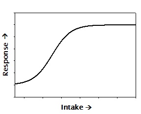 A feature common to most (if not all) nutrients is the effect plateau. If you start from a state of nutrient deficiency, increasing intake of the nutrient concerned produces a measurable, beneficial change in some function or outcome that expresses the nutrient’s activity. For example, if you have iron deficiency anemia and you start taking iron supplements, your hemoglobin and red blood cell count will increase. Your anemia will be treated and, in most cases, cured entirely. But there is a clear limit. Once your hemoglobin reaches normal values (about 14 g/100 mL of blood), no further increases can be produced by taking more iron – even if you double or triple or quadruple the dose. You have reached a plateau.
