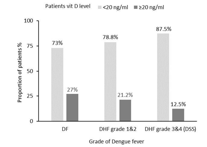 Those not receiving vitamin D were more likely to develop dengue hemorrhagic fever (χ2 = 16.43, P = 0.00). The relative risk of progressing to dengue hemorrhagic fever in patients who received vitamin D compared with those who did not receive vitamin D was 0.0588 (95% CI: 0.0081, 0.4285). However, this study did not assess whether patients were vitamin D deficient at baseline, and did not contain any information about the patients’ diets.