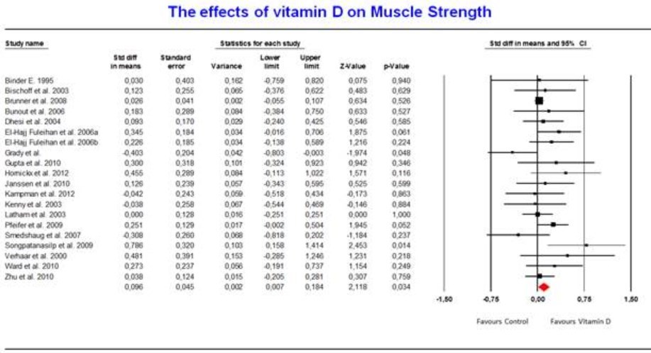 Background: Currently, there is growing evidence that vitamin D plays a role on several tissues including skeletal muscle. Previous studies suggested that vitamin D deficiency is associated with low muscular strength. The objective of this meta-analysis is to summarize the effects of vitamin D supplementation on muscle strength.