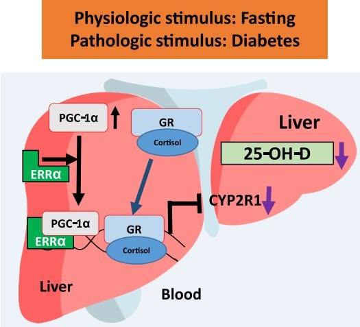Low 25-hydroxyvitamin D levels correlate with the prevalence of diabetes; however, the mechanisms remain uncertain. Here, we show that nutritional deprivation-responsive mechanisms regulate vitamin D metabolism. Both fasting and diabetes suppressed hepatic cytochrome P450 (CYP) 2R1, the main vitamin D 25-hydroxylase responsible for the first bioactivation step. Overexpression of coactivator peroxisome proliferator-activated receptor γ coactivator 1-α (PGC-1α), induced physiologically by fasting and pathologically in diabetes, resulted in dramatic downregulation of CYP2R1 in mouse hepatocytes in an estrogen-related receptor α (ERRα)-dependent manner. However, PGC-1α knockout did not prevent fasting-induced suppression of CYP2R1 in the liver, indicating that additional factors contribute to the CYP2R1 repression. Furthermore, glucocorticoid receptor (GR) activation repressed the liver CYP2R1, suggesting GR involvement in the regulation of CYP2R1. GR antagonist mifepristone partially prevented CYP2R1 repression during fasting, suggesting that glucocorticoids and GR contribute to the CYP2R1 repression during fasting. Moreover, fasting upregulated the vitamin D catabolizing CYP24A1 in the kidney through the PGC-1α-ERRα pathway.