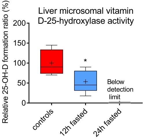 It appears in this study that Vitamin D activation in rodents is temporarily lowered by 50% by a 12 hour fast