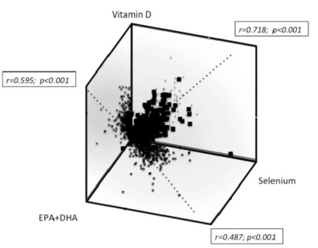 Fig. 2. Three-dimensional plot illustrating the covariance between nutrient intake of omega-3 PUFAs (EPA and DHA), selenium and Vitamin D. Intake was assessed by food frequency questionnaires completed by 158 volunteers in the FISHGASTRO study (Pot et al., 2009). Filled squares represent the x, y, z coordinates while crosses are the 2D coordinates for EPA + DHA v vitamin D and empty circles EPA + DHA v selenium. Grey spots represent the coordinates for vitamin D v selenium intake.