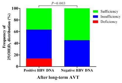 After the patients went through the long-term antiviral treatments, both the mean level of 25(OH)D3 and the percent of patients with sufficient 25(OH)D3 increased significantly.