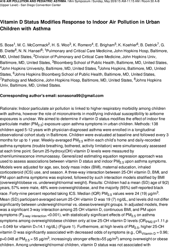 Vitamin D Status Modifies Response to Indoor Air Pollution in Urban Children with Asthma