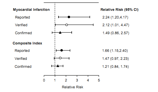 Figure 1. (from PDF) Summary of the relative risk for myocardial infarction (MI) and the composite endpoint of MI, stroke or sudden death based on self report, verified (reported events verified by a physician) and confirm events (includes verified events and events obtained from the New Zealand national database on hospital admissions) in healthy postmenopausal women in the calcium supplementation compared to placebo group involved in the Auckland Calcium Study [20].