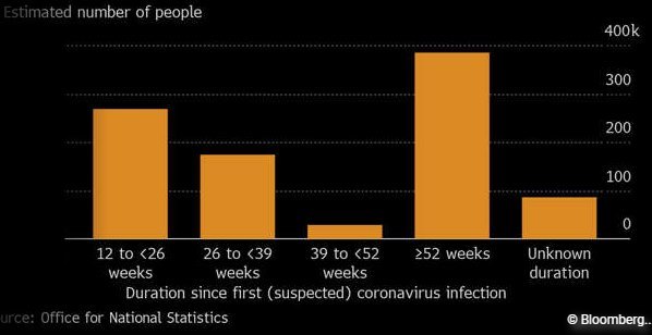 - An estimated 962,000 people, or 1.5% of the population, have experienced self-reported long Covid symptoms in the U.K., according to data from the Office for National Statistics published earlier this month. More than a third of those said they’ve suffered for more than a year.