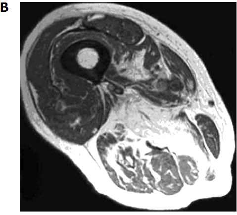 For illustration, Figure 2 shows MRI of two different grade of fatty atrophy involving thigh muscle in patients with vitamin D deficiency. The hypothesis that arose was that atrophy of skeletal muscle fibers and their replacement by fat tissue are the anatomic basis for the impairment in muscular performance described in older vitamin D-deficient people[4]. It may supposed that fatty substitution related to vitamin D deficiency may be the result of the lack of the known trophic effects of vitamin D on skeletal muscle cells[4]. If the thigh muscles are affected, the lack of enough muscular bulk may hamper balance and gait. Clinical scores were concordant with this observation. Concerning technical MRI protocols we suppose that a standard, patient-friendly protocol, including T1 and T2 weighted sequences may be sufficient for the follow-up of elderly people with potential vitamin D deficiency. In another study of 366 older patients receiving MRI of one shoulder for the investigation of potential rotator cuff injury, a correlation between higher fatty infiltration of rotator cuff muscles and lower serum levels of 25D was reported[22]. After multivariate linear regression analysis, this association remained statistically significant in two muscle groups (i.e., supraspinatus and infraspinatus muscles) but only among those whose MRI also demonstrated a full-thickness rotator cuff tear (228 patients).