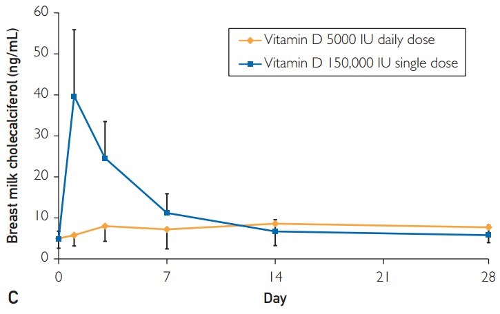 In mothers given daily cholecalciferol, concentrations of serum and breast milk cholecalciferol attained steady levels of 18 and 8 ng/mL, respectively, from day 3 through 28. In mothers given the single dose, serum and breast milk cholecalciferol peaked at 160 and 40 ng/mL, respectively, at day 1 before rapidly declining. Maternal milk and serum cholecalciferol concentrations were related (r=0.87). Infant mean serum 25-hydroxyvitamin D concentration increased from 17±13 to 39±6 ng/mL in the single-dose group and from 16±12 to 39±12 ng/mL in the daily-dose group (P=.88). All infants achieved serum 25-hydroxyvitamin D concentrations of more than 20 ng/mL.