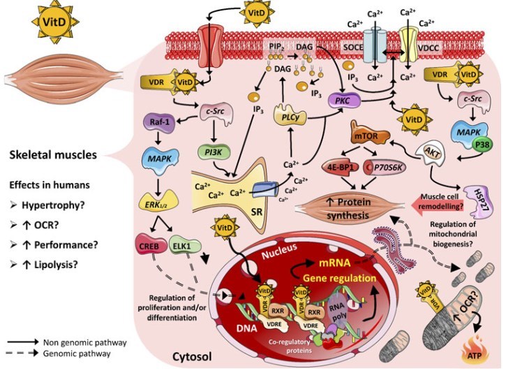 Vitamin D receptor expression and associated function have been reported in various muscle models, including C2C12, L6 cell lines and primary human skeletal muscle cells. It is believed that 1,25-hydroxyvitamin D3 (1,25(OH)2D3), the active form of vitamin D, has a direct regulatory role in skeletal muscle function, where it participates in myogenesis, cell proliferation, differentiation, regulation of protein synthesis and mitochondrial metabolism through activation of various cellular signalling cascades, including the mitogen-activated protein kinase pathway(s). It has also been suggested that 1,25(OH)2D3 and its associated receptor have genomic targets, resulting in regulation of gene expression, as well as non-genomic functions that can alter cellular behaviour through binding and modification of targets not directly associated with transcriptional regulation. The molecular mechanisms of vitamin D signalling, however, have not been fully clarified. Vitamin D inadequacy or deficiency is associated with muscle fibre atrophy, increased risk of chronic musculoskeletal pain, sarcopenia and associated falls, and may also decrease RMR. The main purpose of the present review is to describe the molecular role of vitamin D in skeletal muscle tissue function and metabolism, specifically in relation to proliferation, differentiation and protein synthesis processes. In addition, the present review also includes discussion of possible genomic and non-genomic pathways of vitamin D action.References
