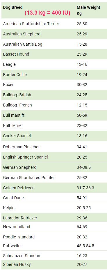 - Many Dog breeds get more Vitamin D than humans (generally recommend 30 IU/kg = 400 IU per 13.3 kg)