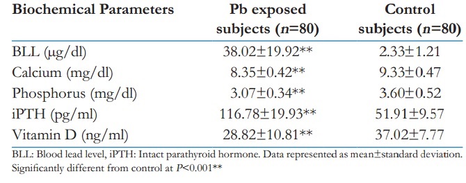 Results: Upon analysis it was observed that serum calcium, phosphorous, and vitamin D levels were significantly decreased (8.35 ± 0.42 mg/dl, 3.07 ± 0.34 mg/dl, and 28.82 ± 10.81 ng/ml respectively; _P< 0.001), whereas the BLL and serum iPTH levels were significantly increased (38.02 ± 19.92 pg/dl and 116.78 ± 19.93 pg/ml respectively;尸<0.001) in Pb exposed subjects as compared to control subjects.