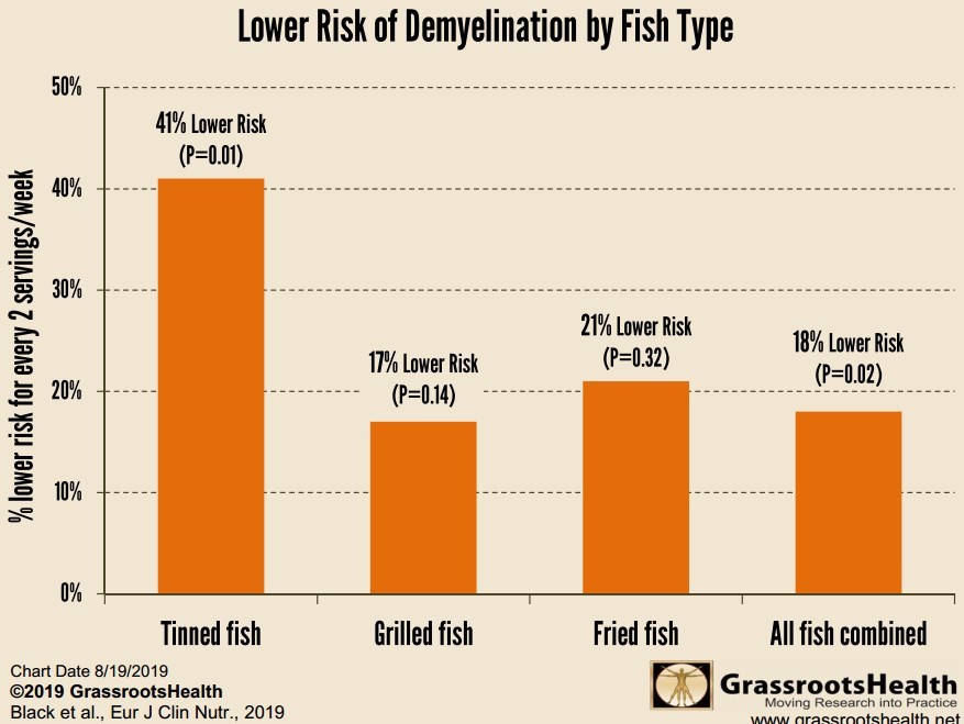 Tinned fish is predominantly oily, whereas grilled and fried fish are likely to be a combination of oily and white types. Oily fish is high in vitamin D and very long chain polyunsaturated omega-3 fatty acids, both of which may be beneficial in relation to MS.