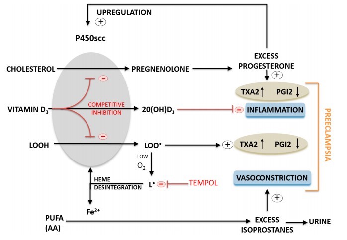 A randomized prospective clinical study performed on a group of 74 pregnant women (43 presenting with severe preeclampsia) proved that urinary levels of 15-F2t-isoprostane were significantly higher in preeclamptic patients relative to the control (3.05 vs. 2.00 ng/mg creatinine). Surprisingly enough, plasma levels of 25-hydroxyvitamin D3 in both study groups were below the clinical reference range with no significant difference between the groups. In vitro study performed on isolated placental mitochondria and placental cell line showed that suicidal self-oxidation of cytochrome P450scc may lead to structural disintegration of heme, potentially contributing to enhancement of oxidative stress phenomena in the course of preeclampsia. As placental cytochrome P450scc pleiotropic activity is implicated in the metabolism of free radical mediated arachidonic acid derivatives as well as multiple Vitamin D3 hydroxylations and progesterone synthesis, we propose that Vitamin D3 might act as a competitive inhibitor of placental cytochrome P450scc preventing the production of lipid peroxides or excess progesterone synthesis, both of which may contribute to the etiopathogenesis of preeclampsia. The proposed molecular mechanism is in accord with the preliminary clinical observations on the surprisingly high efficacy of high-dose Vitamin D3 supplementation in prevention and treatment of preeclampsia.