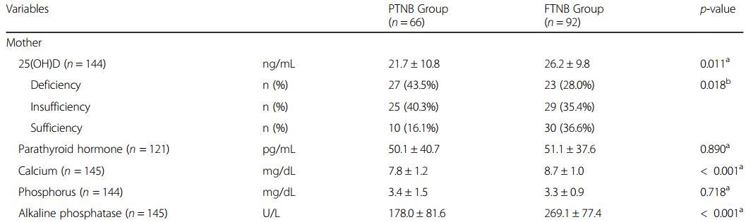 This cross-sectional study was conducted with 66 mothers who had given birth to preterm babies and their preterm newborns (PTNB, < 32 weeks), and 92 women who had given birth at the full-term of their pregnancy and their newborns (FTNB). Data were collected on the characteristics of mothers (gestational age, diseases, and habits) and newborns (anthropometry and adequacy for gestational age). Ten milliliters of blood were drawn from the mothers and the umbilical cord of newborns at birth to identify the 25(OH)D, parathyroid hormone, calcium, phosphorus, and alkaline phosphatase concentrations.