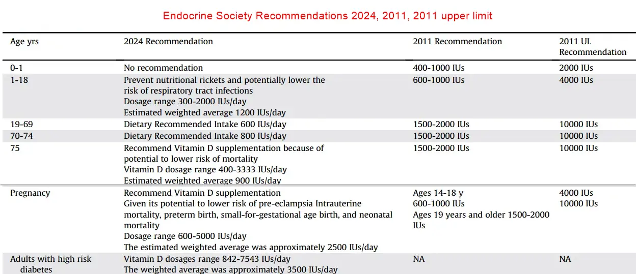 - VitaminDWiki - Endocrine Society recommends for the healthy: no Vitamin D tests, just RDA (many object) - July 2024