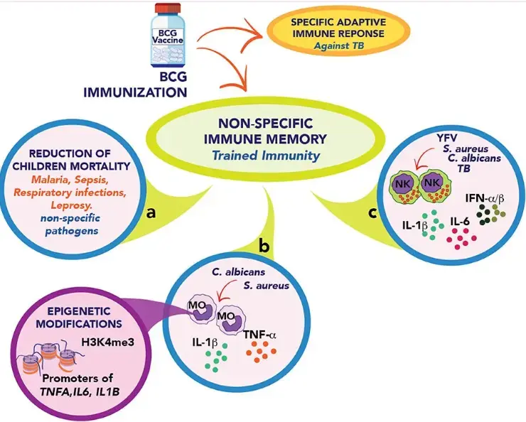 - “Besides protection against tuberculosis, BCG has been shown to reduce the mortality of children due to infection by unrelated pathogens due to a non-specific immune cross-protection”