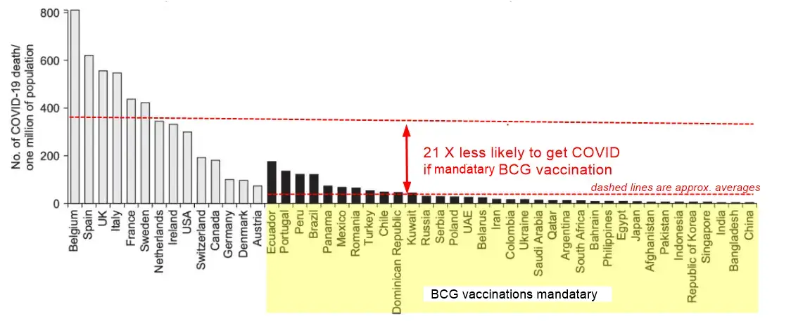 - “Jirjees et al found that the occurrence of death due to COVID-19 was 21-fold lower in countries with a national BCG vaccination policy “