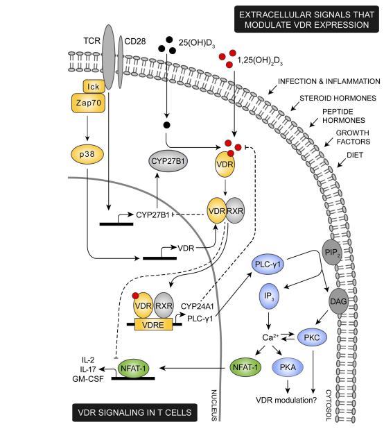Various extracellular signals including infection, inflammation, steroid and peptide hormones, and diet are involved in regulation of the intracellular VDR level. During an immune response theTCR is triggered by specific antigens, inducing a cascade of intracellular signaling events. Among these, lck and ZAP-70 are activated leading to activation of the p38 kinase which in naive human T cells induce expression of VDR.TCR triggering also promotes expression of the 1,25(OH)2D3 synthesis enzyme CYP27B1. Through intrinsic synthesis of 1,25(OH* 3 and uptake of 1,25(OH*3 from the extracellular environment, VDR is activated and translocated into the nucleus where it either induce or suppress transcription of a variety of genes. As an example, VDR induce upregulation of PLC-y1 in naive human T cells. Once PLC-y1 is expressed, TCR induced activation of PLC-y1 leads to activation of PKA and PKC and an increase in the intracellular calcium level. In other cell types PKA and PKC has been shown to modulate expression of VDR, depending on the particular cell type and cellular differentiation state investigated. An increase in intracellular calcium concentration activates NFAT1 a necessary transcription factor for expression of IL-2 and other cytokines. IL-2 is a cytokine required for proliferation of T cells and one mechanism by which VDR adjustT cell activity is to outcompete NFAT1's binding to the IL-2 promoter and furthermore to down-regulate the actual expression of NFAT1.To control VDR activity a series of negative feedback loops exists; activated VDR both induce expression of the 1,25(OH)2D3 degrading enzyme CYP24A1 and down-regulates expression of the 1,25(OH)2D3 synthesizing enzyme CYP27B1.