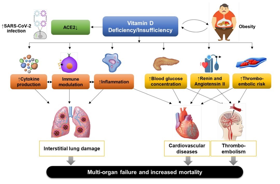 - Fig. 1 Proposed pathogenic mechanisms leading to severe COVID- 19 outcomes in individuals with vitamin D deficiency or insufficiency. ACE2, angiotensin-converting enzyme 2; COVID-19, coronavirus disease 2019; SARS-CoV-2, severe acute respiratory syndrome coronavirus 2. References for evidence: cytokine production [41]; immune modulation [18, 29]; inflammation [53]; blood glucose concentration [149]; renin and angiotensin II levels [64]; and thromboembolic risk [104]