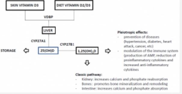 The primary and most established role of VD is the maintenance of calcium and phosphorus homeostasis in bone mineralization; deficiency of these minerals can lead to rickets, osteomalacia, and osteoporosis (Caccamo et al., 2018; Izadpanah and Khalili, 2013). As VD is liposoluble, it can enter cells as a steroid hormone and initiate its pleiotropic effects, protecting the organism against infection, heart disease, cancer, hypertension, autoimmune disease, and diabetes (Al Nozha, 2016; Flynn et al., 2012; Goldsmith, 2015).