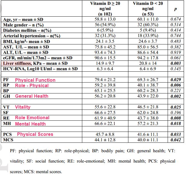 Download the PDF from Sci-Hub via VitaminDWikiVitamin D deficiency is common in patients with chronic liver disease, including chronic hepatitis C (CHC). However, the interplay between serum 25-hydroxy-vitamin-D (25-OH-D) and health-related-quality-of-life (HRQoL) in CHC subjects has never been investigated. The study aimed to analyze the relationship between vitamin D deficiency and HRQoL in CHC patients. One-hundred-fifty-five consecutive CHC patients completed the Health-Survey-Short-Form-36 (SF-36) and their serum 25-OH-D levels were evaluated. Vitamin D deficiency was defined as a 25-OH-D level lower than 20 ng/mL.