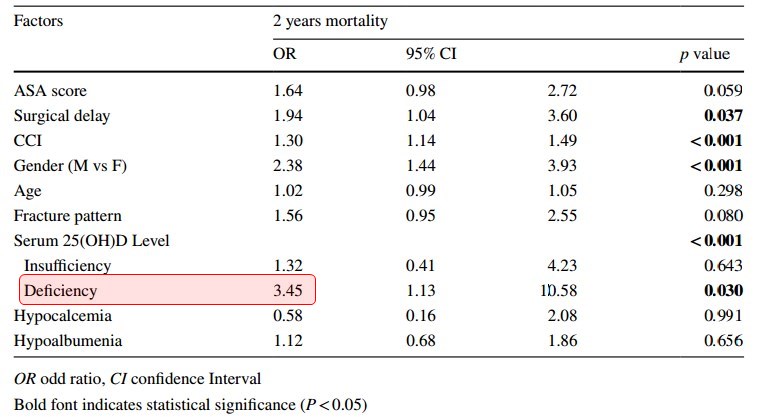 Conclusions In this study, we showed a high prevalence of hypovitaminosis D among the osteoporotic hip fracture population and its impact on 2-year survivorship after hip fracture surgery.