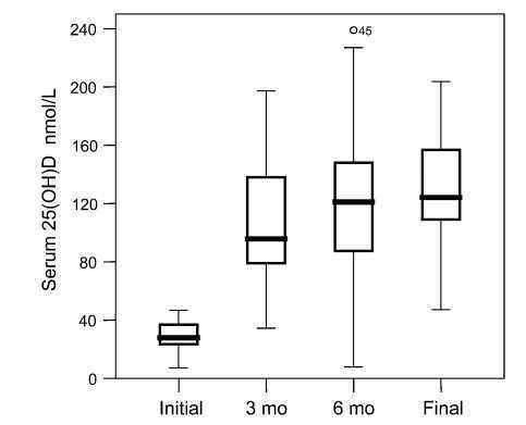 RESULTS: The initial mean (+/-SD) serum 25(OH)D concentration was 28.5 +/- 10.8 nmol/L. After 12 mo, the 25(OH)D concentration was 125.6 +/- 38.8 nmol/L, and it exceeded 74 nmol/L in 92% of the patients. At every 3-mo follow-up, serum parathyroid hormone was lower than at baseline (P = 0.001). No changes in serum calcium or cases of hypercalcemia were observed at the follow-up assessments. Both mean total urinary calcium and the mean urinary calcium-creatinine ratio increased from baseline at one follow-up time point (P < 0.05). Between baseline and the 12-mo visit, z scores for bone mineral density at the lumbar spine and the hip both increased significantly (P < 0.001).