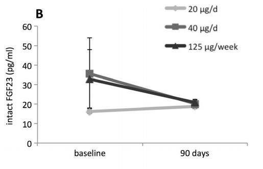 A total of 87 Caucasian, community-dwelling, postmenopausal women, aged 55 years or older, with vitamin D inadequacy (serum 25(OH)D levels <30 ng/ml, with mean 25(OH)D below 20 ng/ml, namely 16.5 ± 7.5 ng/ml) were randomized to receive three different dosages of calcidiol: 20 μg/day, 40 μg/day, and 125 μg/week for 3 months. The attained level of serum 25(OH)D was selected as primary endpoint to assess efficacy, while other parameters of mineral metabolism, (serum calcium, parathyroid hormone, phosphate, FGF23, urinary calcium, and markers of bone turnover) were assessed as secondary endpoints to establish safety.RESULTS:
