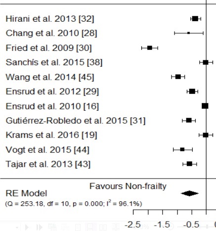 Zhou J1, Huang P2, Liu P3, Hao Q3, Chen S4, Dong B5, Wang J6.There is a biologically plausible association between low vitamin D, specifically serum 25-hydroxyvitamin D 25(OH)D level, and frailty. We conducted a systematic review and meta-analysis to describe the association between low 25(OH)D level and frailty. We searched literature in OVID (Medline), EMBASE, Web of Knowledge and Cochrane CENTRAL Library Issue in May 2016, for cohort studies evaluating association of low 25(OH)D level with the risk of frailty. Studies were reviewed in accordance with the Preferred Reporting Items for Systematic Reviews and Meta-Analyses(PRISMA) guidelines. A total of seven studies(17,815 participants)were eligible in our study.