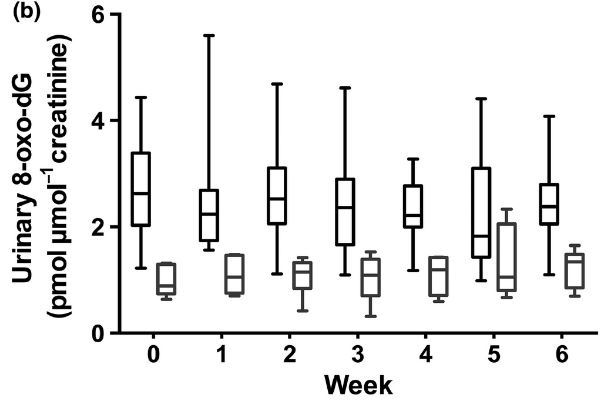 Fig 3. Urinary 8 -oxo-deoxyguanosine (8 -oxo-dG) damage (pmol pmol-1 creatinine) in volunteers with skin types II and V. Urinary 8 -oxo-dG concentrations (a) daily for the first 5 days of week 1 and (b) weekly during the 6-week simulated summer. Patients of phototype V (n = 6) had significantly lower 8 -oxo-dG levels than those of phototype II (n = 10) both in the first 5 days (including prior to exposure) and during the study (P = 0-001 and P = 0-002, respectively, repeated measures). However, no increase in urinary oxidative DNA damage was seen at any of the time points following a single UVR exposure during the first 5 days, and no accumulation occurred over the 6-week course. The data shown are the median, interquartile range and full range.