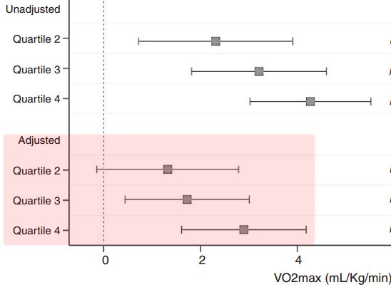Note: Adjustment variables not stated - suspect they overadjusted for BMI, etc.The small number of studies that have investigated the relationship between serum vitamin D levels and cardiorespiratory fitness (CRF) have reported conflicting results. We investigated the association between vitamin D levels and CRF in a representative sample of the US population using data from the National Health and Nutrition Survey (2001–2004).