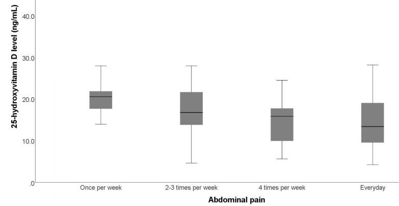 The severity of irritable bowel syndrome symptoms and school absence were evaluated. Vitamin D levels were measured by serum 25-hydroxyvitamin D. The chi-square test and analysis of variance were used. The patients’ average vitamin D level was 16.25 ± 6.58 ng/mL. There was a significant negative association of the 25-hydroxyvitamin D level with symptom severity and school absence (p = 0.022 and p < 0.001, respectively). Vitamin D supplementation could be considered as a choice of therapeutic method