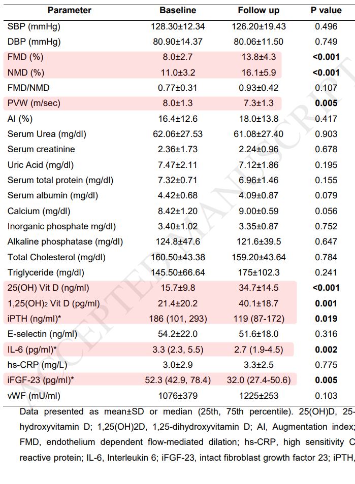 - Cholecalciferol supplementation in patients with CKD and vitamin D deficiency improved endothelial function (FMD) and vascular stiffness (PWV).