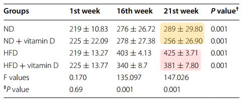 According to our results, vitamin D reduced food intake and weight gain and modulated the HFD induced inflammatory response in hippocampus and hypothalamus of high fat diet induced obesity. Therefore, this neurosteroid, can be suggested as a supplemental therapeutic tool in prevention of obesity related cognitive and neurodegenerative problems.Less weight gain if add Vitamin D, even if have a high fat diet (in rats) – RCT Dec 201710108 visitors, last modified 09 Sep, 2025, This page is in the following categories (# of items in each category)Attached files