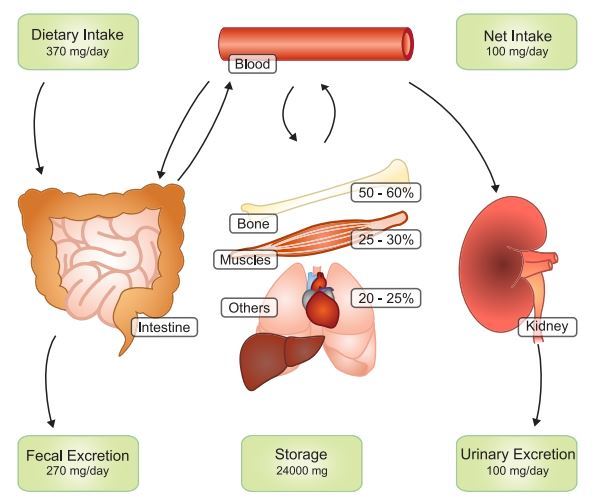However, the opposite also holds true; patients may be severely Mg2+ deficient, although serum or RBC Mg2+ levels are normal. In this case, the Mg2+ concentrations in bones and soft tissues are severly decreased, after long-term compensatory Mg2+ release to keep serum Mg2+ levels within normal range. To identify such patients, a Mg2 + loading test has been proposed in which acute oral Mg2 + administration is used to assess Mg2+ retention (363). In this test, the serum Mg2+ concentration and fecal Mg2 + excretion are calculated to determine intestinal Mg2+ absorption. Mg2+-deficient patients will have lower bone Mg2+ content and therefore show high Mg2+ retention (90). Thus the loading test allows quantification of the exchangeable pool of Mg2+, which is more sensitive than serum Mg2+ concentrations. However, this test is rarely used in clinic, and as a result, standardization is lacking. Within a research setting, a urine excretion of <60% of the Mg2+ load is generally considered normal.