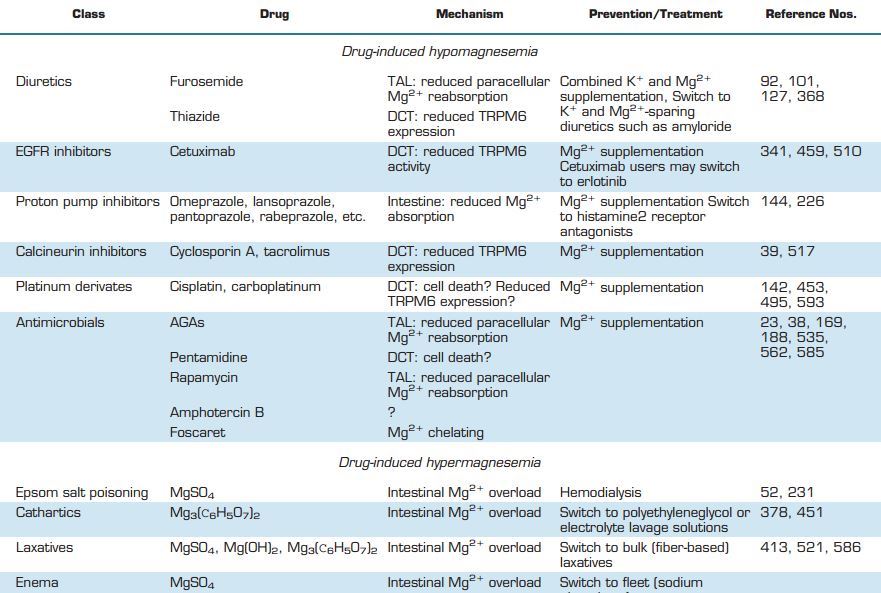 The following section of this review will focus on the causes of hypomagnesemia. Drug-induced and genetic hypomagnesemia will be distinhished from more general origins of Mg2+ deficiency (TABLES 4 AND 5).General causes of hypomagnesemia
