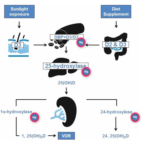 Vitamin D3 (cholecalciferol) is produced in the skin when exposed to sunlight. Vitamin D is therefore not a real vitamin. People with optimal sunlight exposure do not need to consume dietary supplementation. Because standard diets usually do not contain enough vitamin D, safe sunlight exposure or consumption of foodstuffs artificially supplemented with vitamin D are necessary to avert complications related to vitamin D deficiency.30,32,59,60 Vitamin D, either D3 (animal source) or D2 (nonanimal source), does not have significant biological activity. Rather, it needs to be processed further in the liver and kidneys to generate the biologically active form 1,25-dihydroxyvitamin D (1,25[OH]2D). This activation process occurs in 2 steps: (1) within the liver, cholecalciferol is hydroxy- lated to 25-hydroxycholecalciferol (25[OH]2D) by the enzyme 25-hydroxylase; and (2) within the kidneys, 25-hydroxycholecalciferol is converted to 1,25(OH)2D by the enzyme 1a hydroxylase.1,2,32,38,61 The enzymatic activity of both hepatic 25-hydroxylase and renal 1 a-hydroxylase is a magnesium-dependent process. Vitamin D is transported in blood bound to the carrier proteins, and the major carrier is vitamin D-binding protein. Importantly, the activity of vitamin D-binding protein is also a magnesium-dependent process (Figure 2).62'63