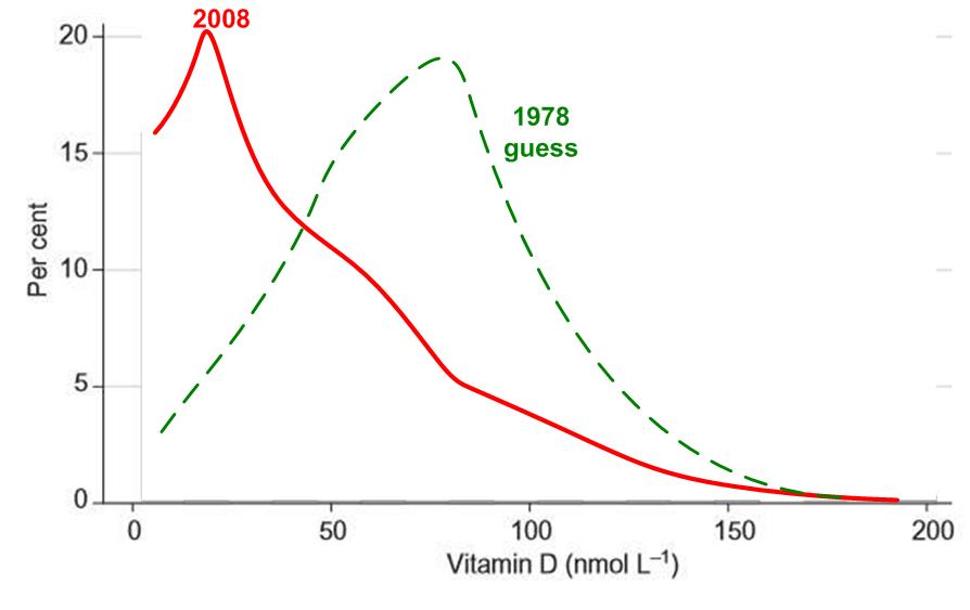 Chart of 2008 actual, and guessed 1978 vitamin D levels in England