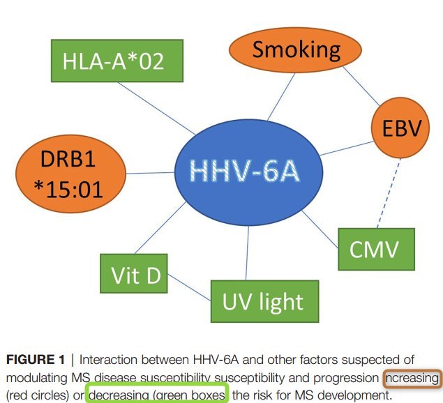 Furthermore, HHV-6A infection interacts with other factors suspected of modulating MS susceptibility and progression such as infection with- Epstein-Barr virus (EBV) and