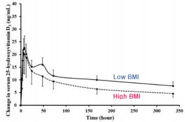Results: Data were expressed as means ± SEMs. The PKS of 900 µg vitamin D3 revealed that malabsorptive patients had 64% lower AUC than healthy participants (1177 ± 425 vs. 3258 ± 496 ng · h/mL; P < 0.05). AUCs of 900 µg 25(OH)D3 were not significantly different between the 2 groups (P = 0.540). The 10 healthy participants were ranked by BMI and categorized into higher/lower BMI groups (5/group). The PKS of 900 µg vitamin D3 showed that the higher BMI group had 53% lower AUC than the lower BMI group (2089 ± 490 vs. 4427 ± 313 ng · h/mL; P < 0.05), whereas AUCs of 900 µg 25(OH)D3 were not significantly different between the 2 groups (P = 0.500).