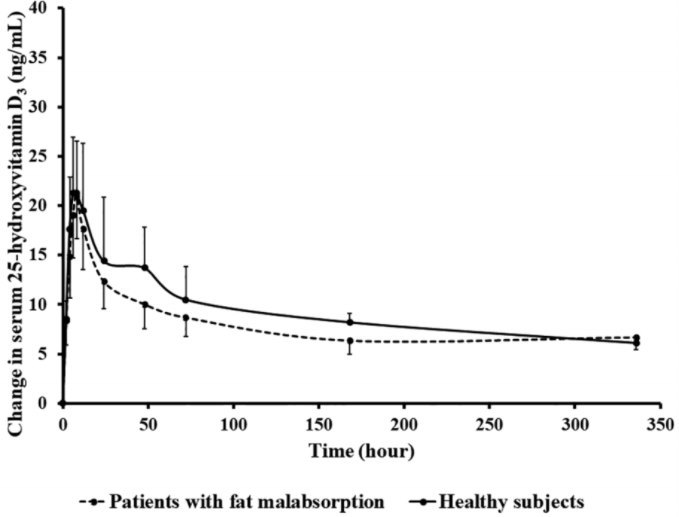 Methods: A randomized, double-blind crossover trial was performed in 6 malabsorptive patients and 10 healthy participants who were given 900 µg of either vitamin D3 or 25(OH)D3 orally followed by a pharmacokinetic study (PKS). After ≥28 d from the first dosing, each participant returned to receive the other form of vitamin D and undergo another PKS. For each PKS, serum vitamin D3 and 25(OH)D3 were measured at baseline and at 2, 4, 6, 8, and 12 h and days 1, 2, 3, 7, and 14. Pharmacokinetic parameters were calculated.