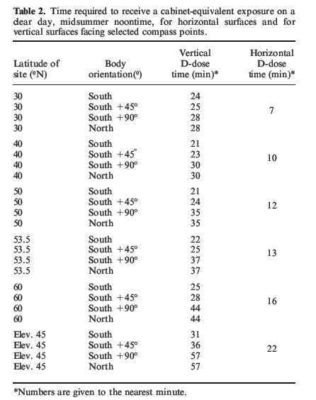 6.0 = 5/6 hourNote: SED is defined for UVA (tanning), not UVB (vitamin D), so it overestimates the amount of vitamin D at high latitudes or non-noon.